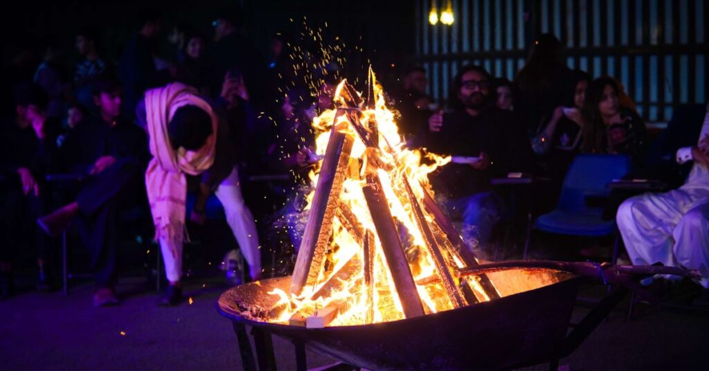 Controlled, cozy bonfire setups with seating, lighting, and safety supervision.